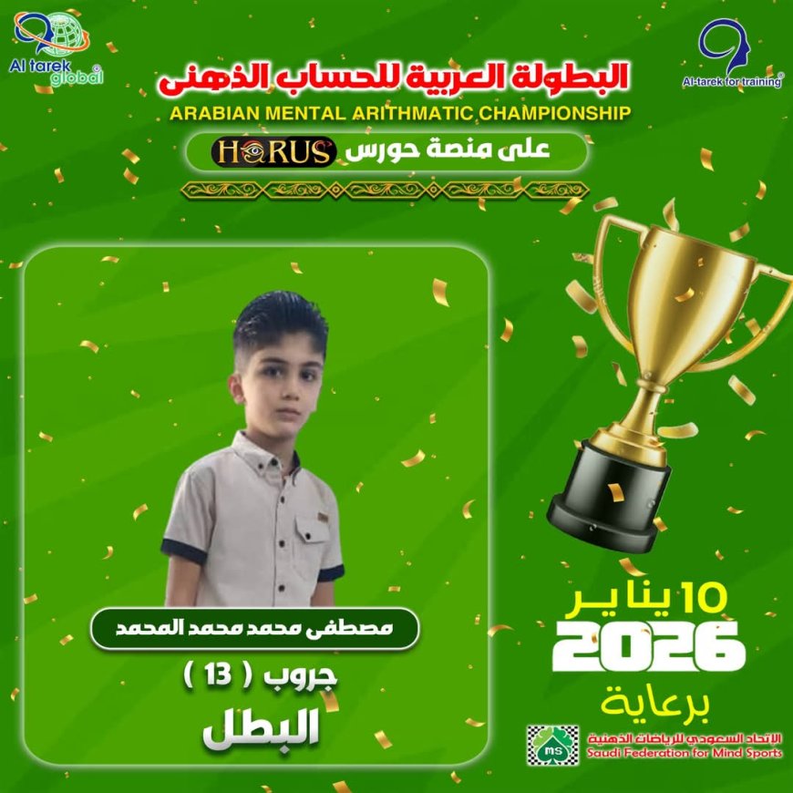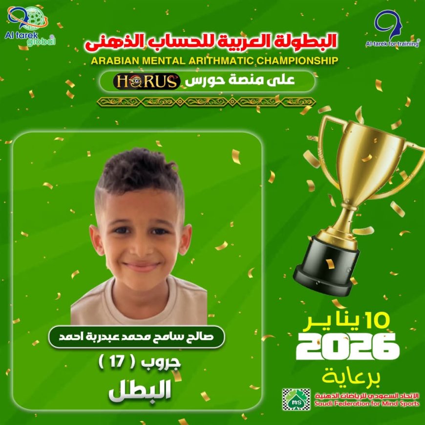 وبفضل الله وتوفيقه حقق أبطالنا الفوز بالمراكز الأولى في البطولة في نسختها الثالثة والتي اقيمت يوم أمس السبت الموافق10يناير2026 في المملكة العربية السعودية وبرعاية الإتحاد السعودي للرياضيات الذهنية حيث شارك فيها أبطال مدارس سماء عدن النموذجية اون لاين عبر منصة HORUS التابعة شركة الطارق جلوبال المنظمة للكثير من المسابقات والبطولات الدولية