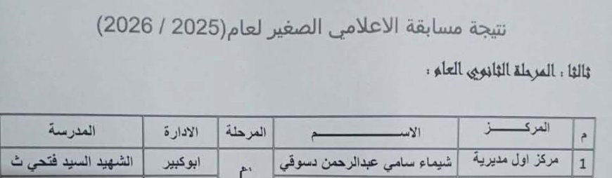 حققت الطالبة شيماء سامي إنجازا مميزا بعد حصولها على المركز الأول في مسابقة الإعلامي الصغير للعام الدراسي 2025–2026، والتي نظمتها مديرية التربية والتعليم بمركز أبو كبير بمحافظة الشرقية، لتؤكد تفوقها وتميزها بين عدد كبير من الطلاب المشاركين في المسابقة.